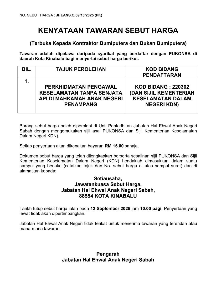 - Tarikh tutup sebut harga ialah pada 12 September 2025 jam 10.00 pagi. Penyertaan yang